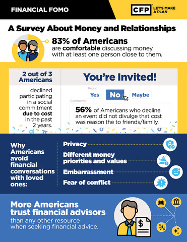 WASHINGTON--(BUSINESS WIRE)--While 83% of Americans say they're comfortable talking about money with at least one person, most stay silent when it comes to admitting financial struggles to others they are close to, including family, friends and co-workers. CFP Board's latest research, Financial FOMO: A Survey About Money and Relationships, reveals that 67% of Americans have declined social events in the past two years primarily due to cost — yet 56% never told their loved ones that money was the reason. From trips with friends (30%) to family holiday gatherings (23%) and weddings (13%), Americans are missing major life events due to financial pressures they feel they can’t discuss openly.